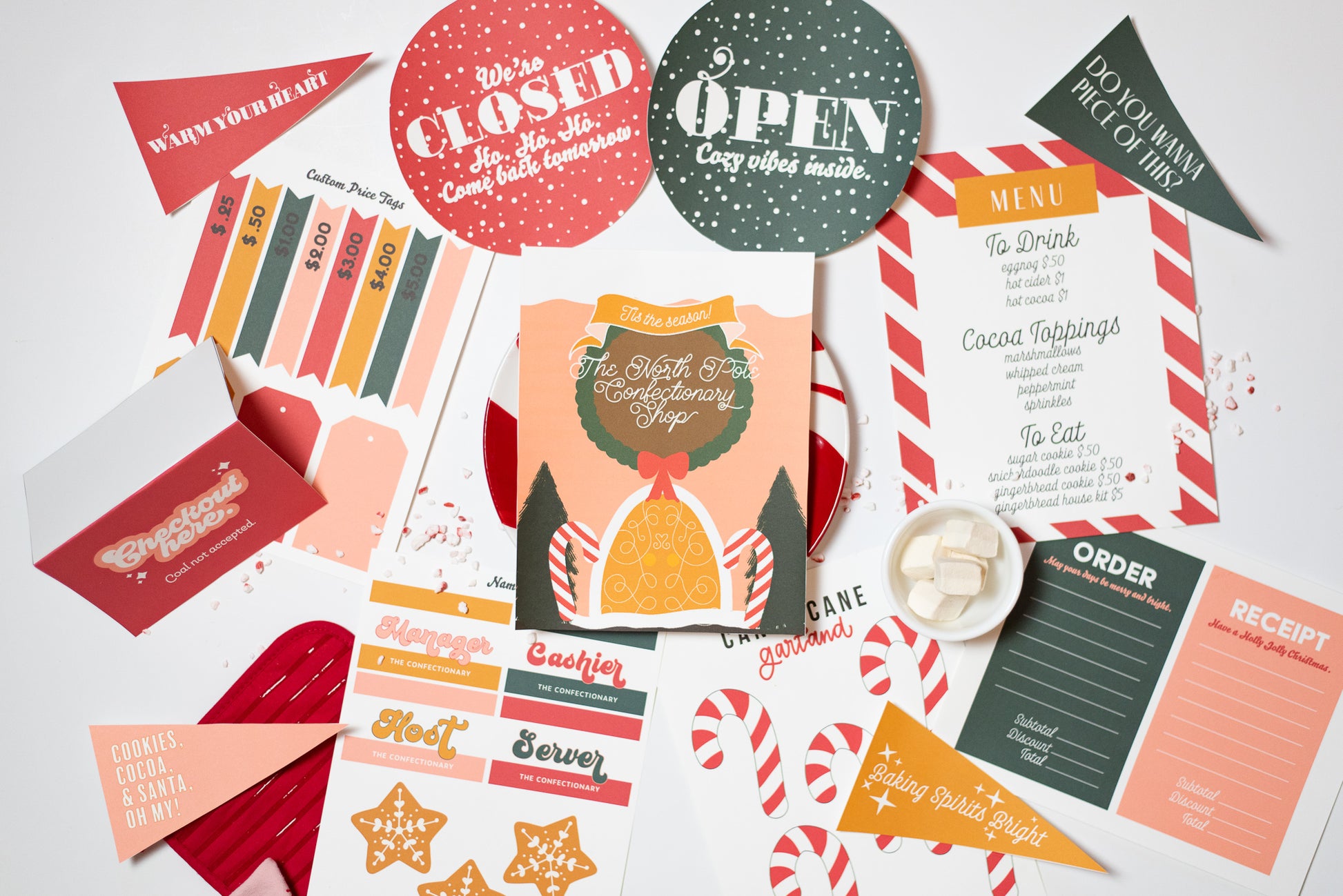 El conjunto completo incluye una impresión artística con 4 archivos JPEG en total, 1 PDF con banderines (4 banderines en total), un menú, etiquetas de precios, etiquetas con nombres, recibos, carteles de abierto/cerrado y elementos de bastones de caramelo que puedes usar para agregar a los banderines o hacer una pancarta. Consulta las fotos de la lista para obtener más detalles.