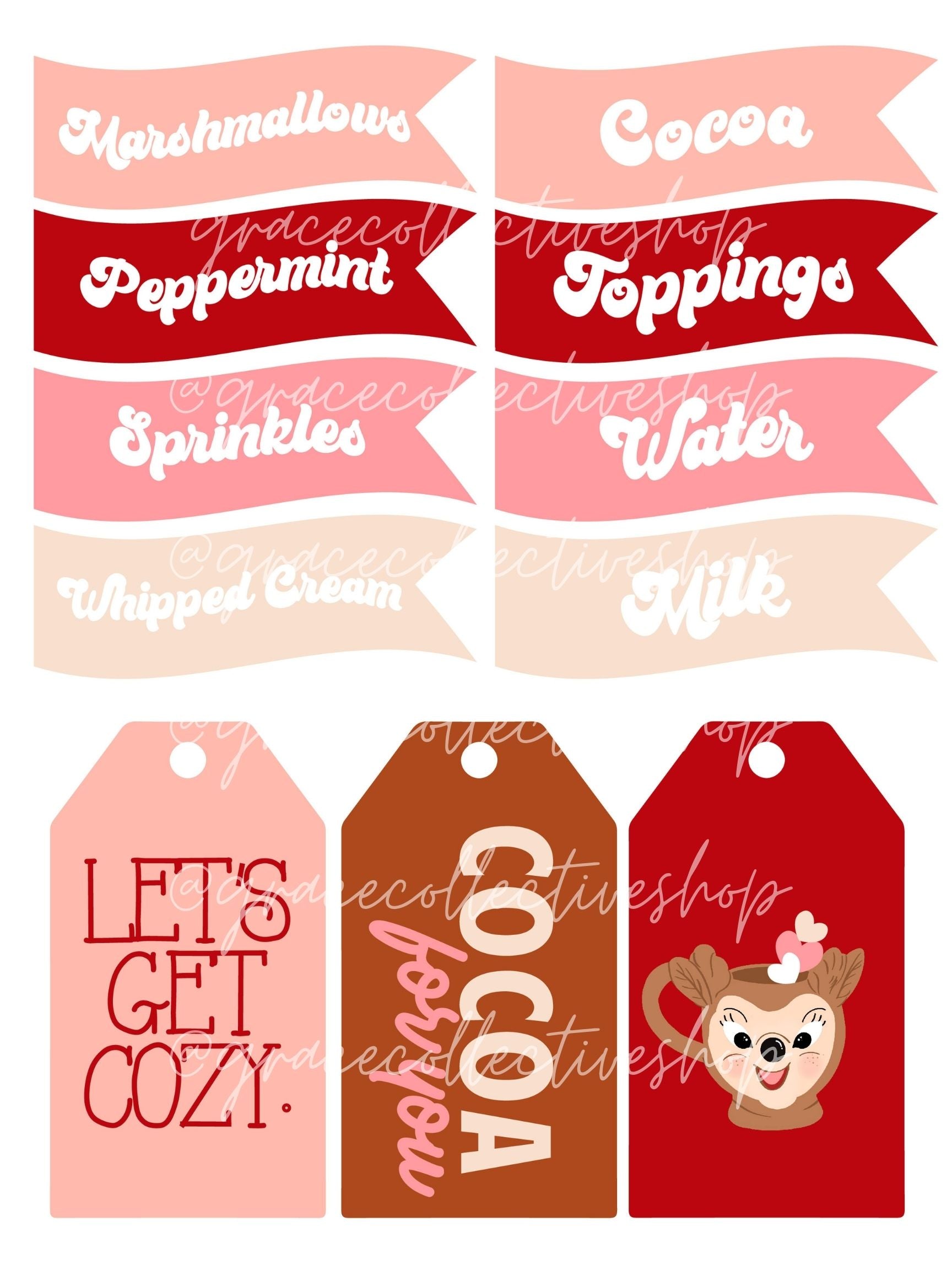 El conjunto completo incluye una lámina con un total de 5 archivos JPEG, un PDF con banderines, banderines grandes, etiquetas para barras de chocolate y, por último, algunas etiquetas para tazas con forma de reno. Consulta las fotos de la lista para obtener más detalles.
