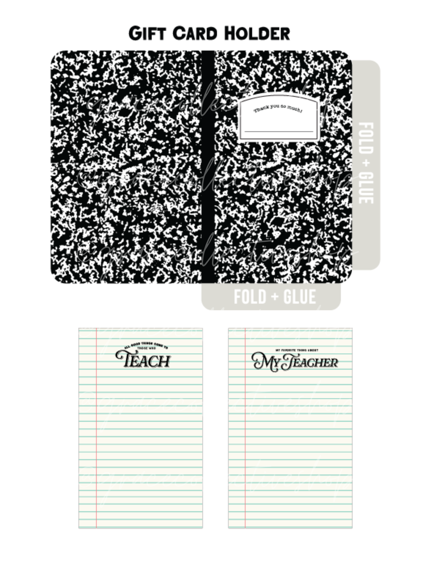 Add your own personal touch to this cute composition book printable sleeve with a note and some stickers! It's the perfect gift card holder for Teacher Appreciation Day or just because!